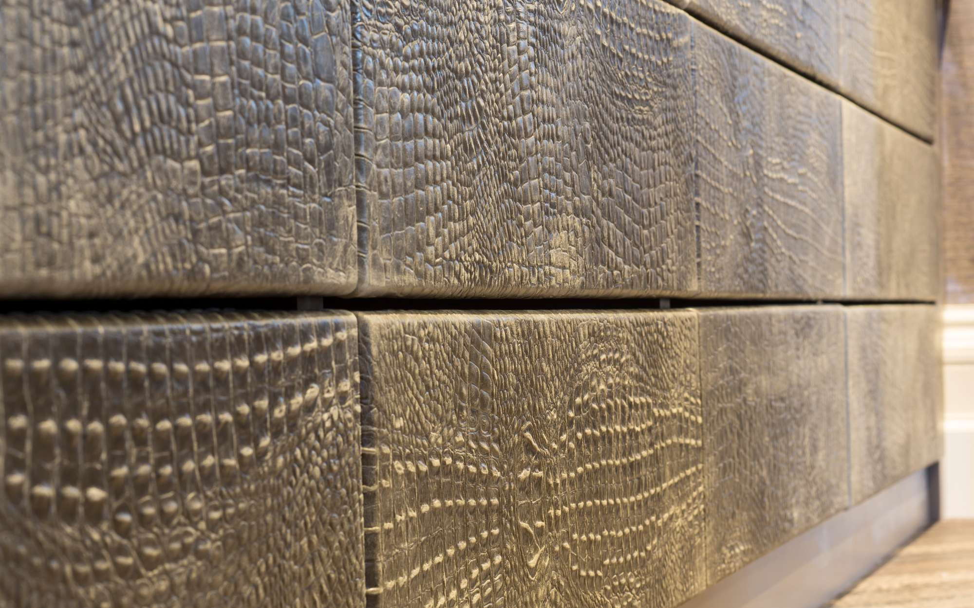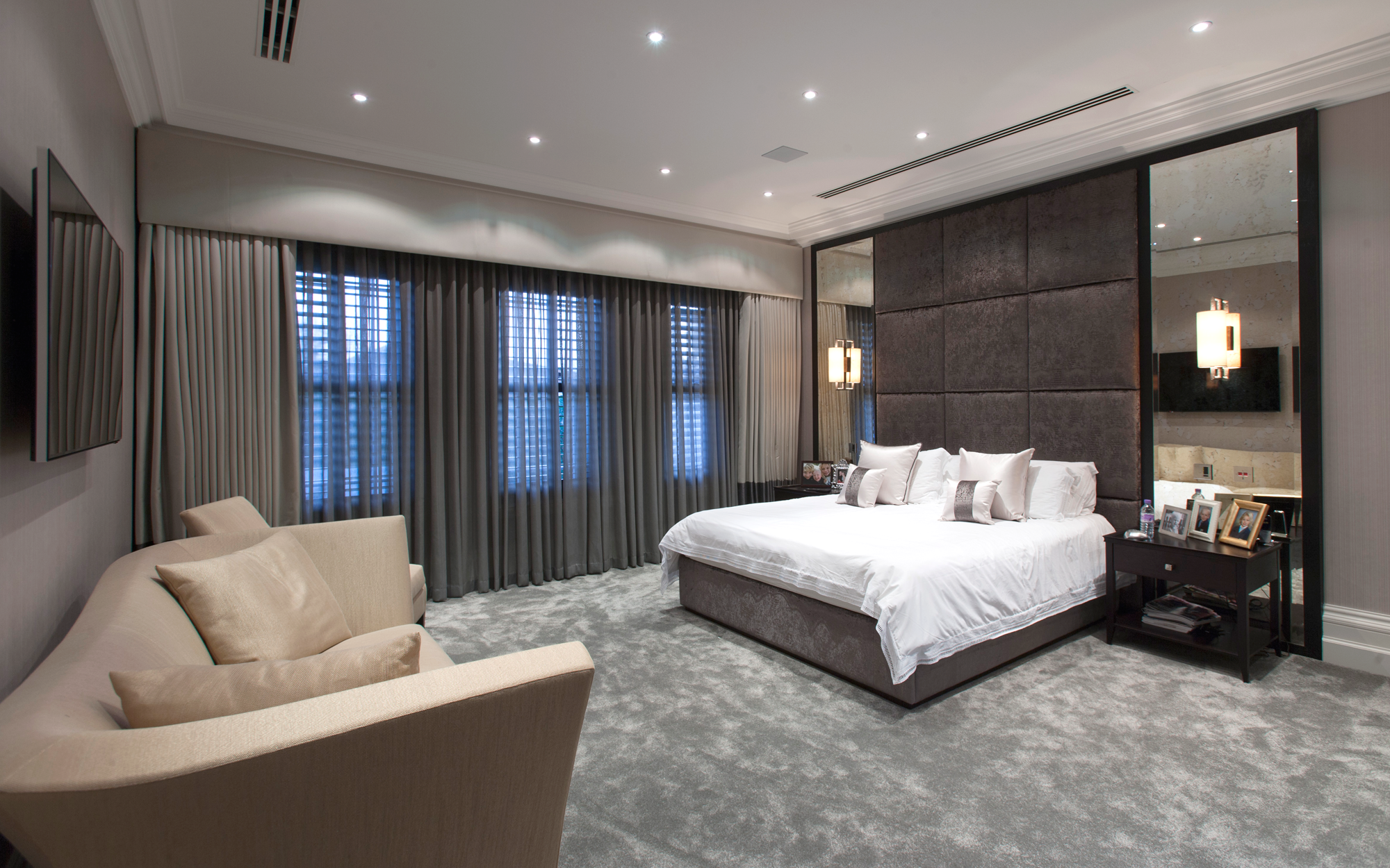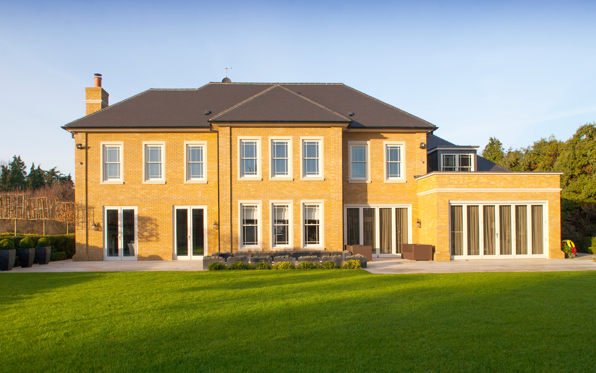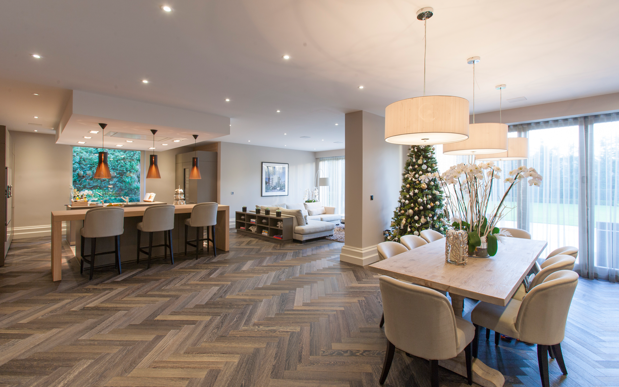 This 8,500 sq ft private commission in Oxshott is a family home featuring a sleek modern look throughout, with bespoke fixtures and fittings making it unique. The study features stunning oak joinery hand-built by craftsmen, paired with parquet flooring throughout. The master suite features drawer-fronts in crocodile leather, a particularly unusual touch.
