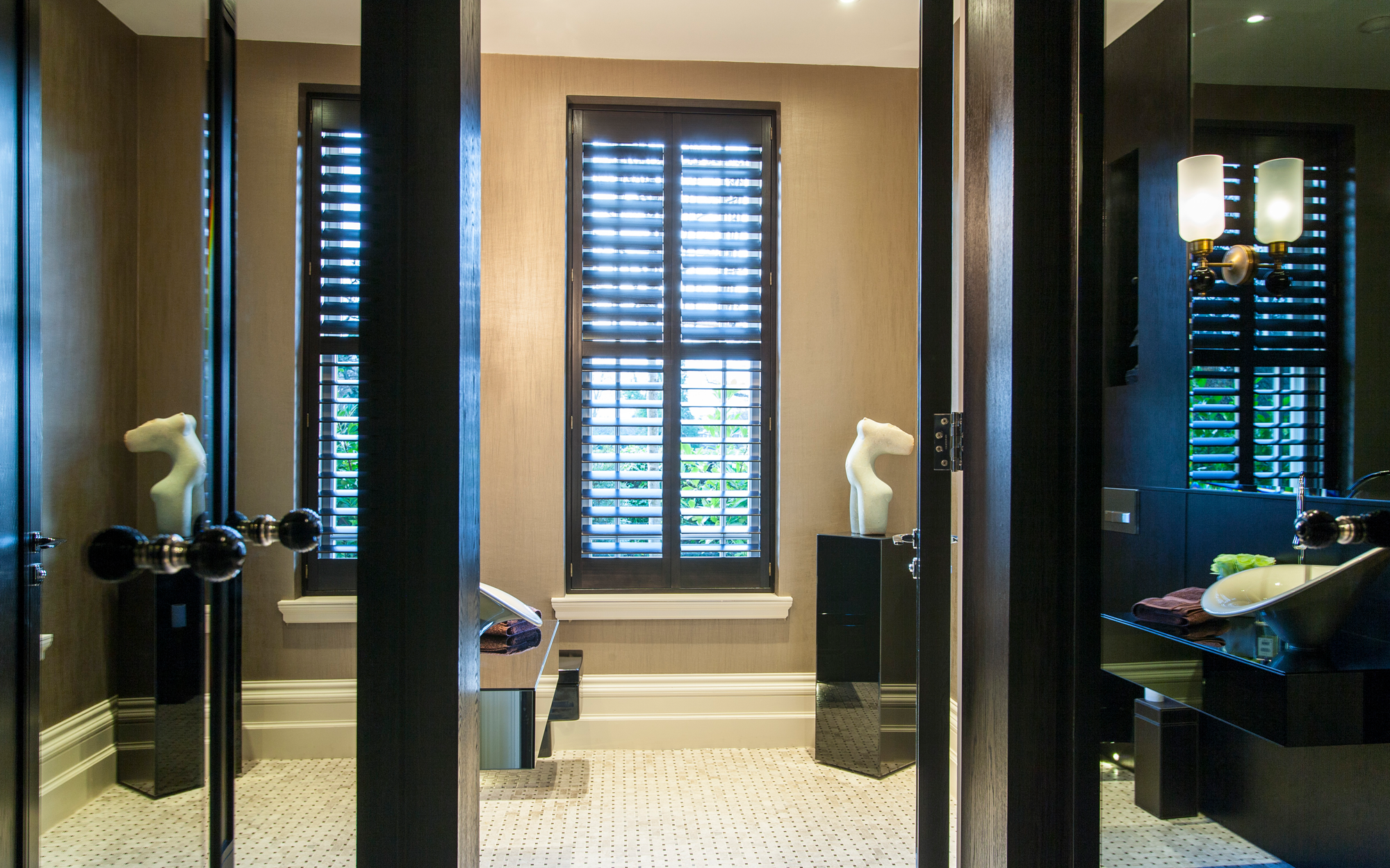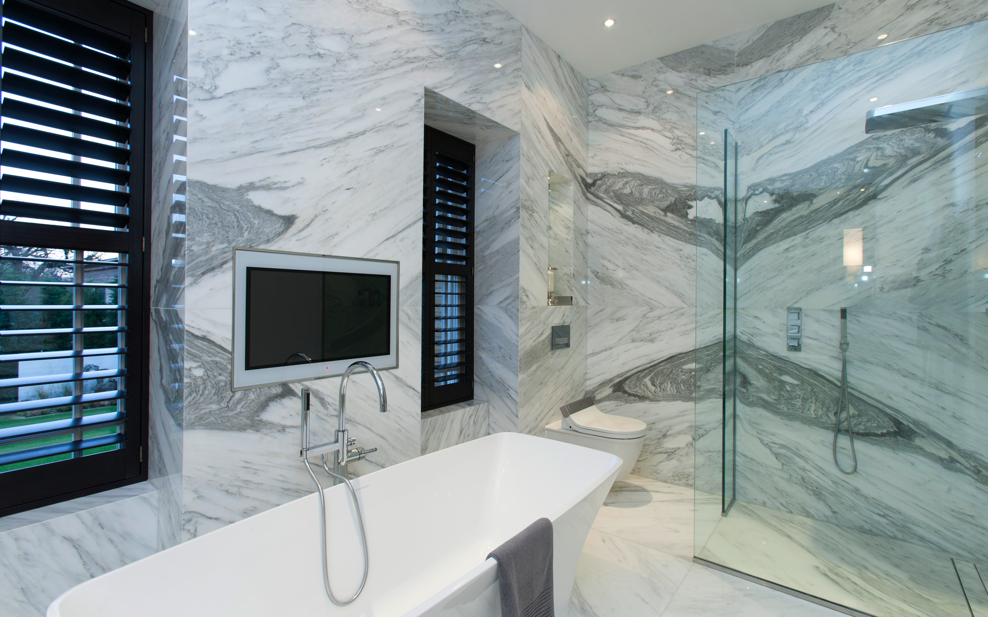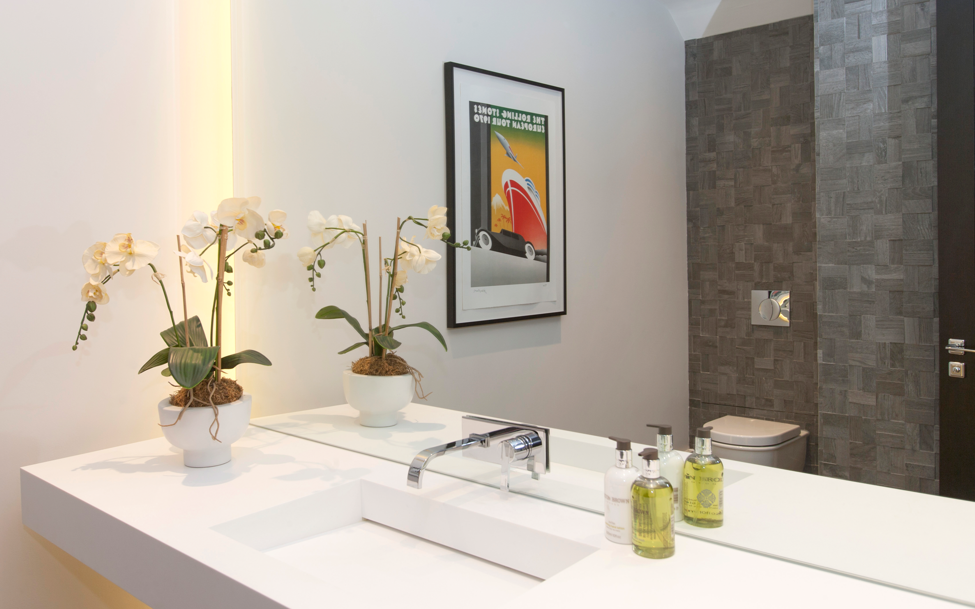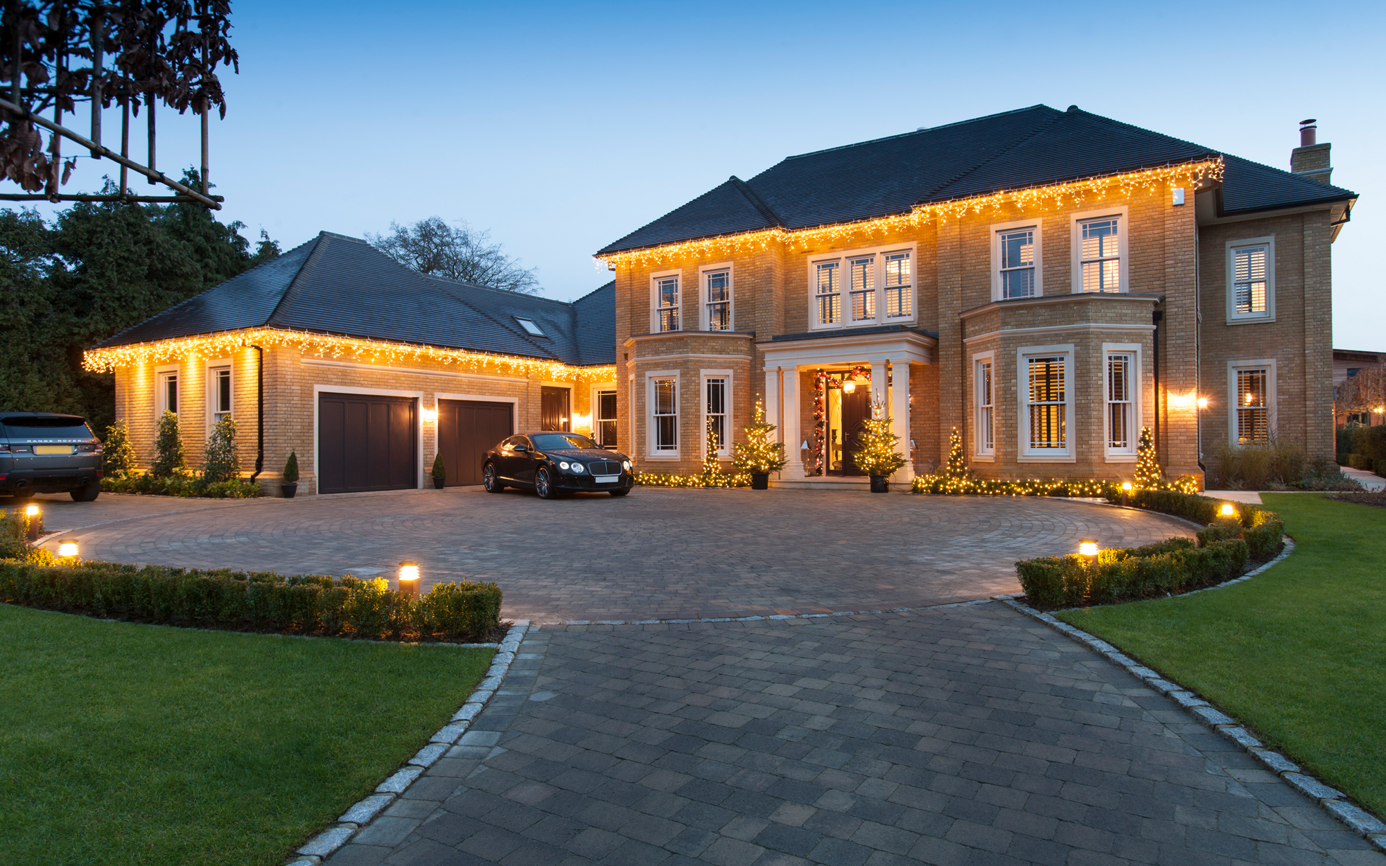 This 8,500 sq ft private commission in Oxshott is a family home featuring a sleek modern look throughout, with bespoke fixtures and fittings making it unique. The study features stunning oak joinery hand-built by craftsmen, paired with parquet flooring throughout. The master suite features drawer-fronts in crocodile leather, a particularly unusual touch.