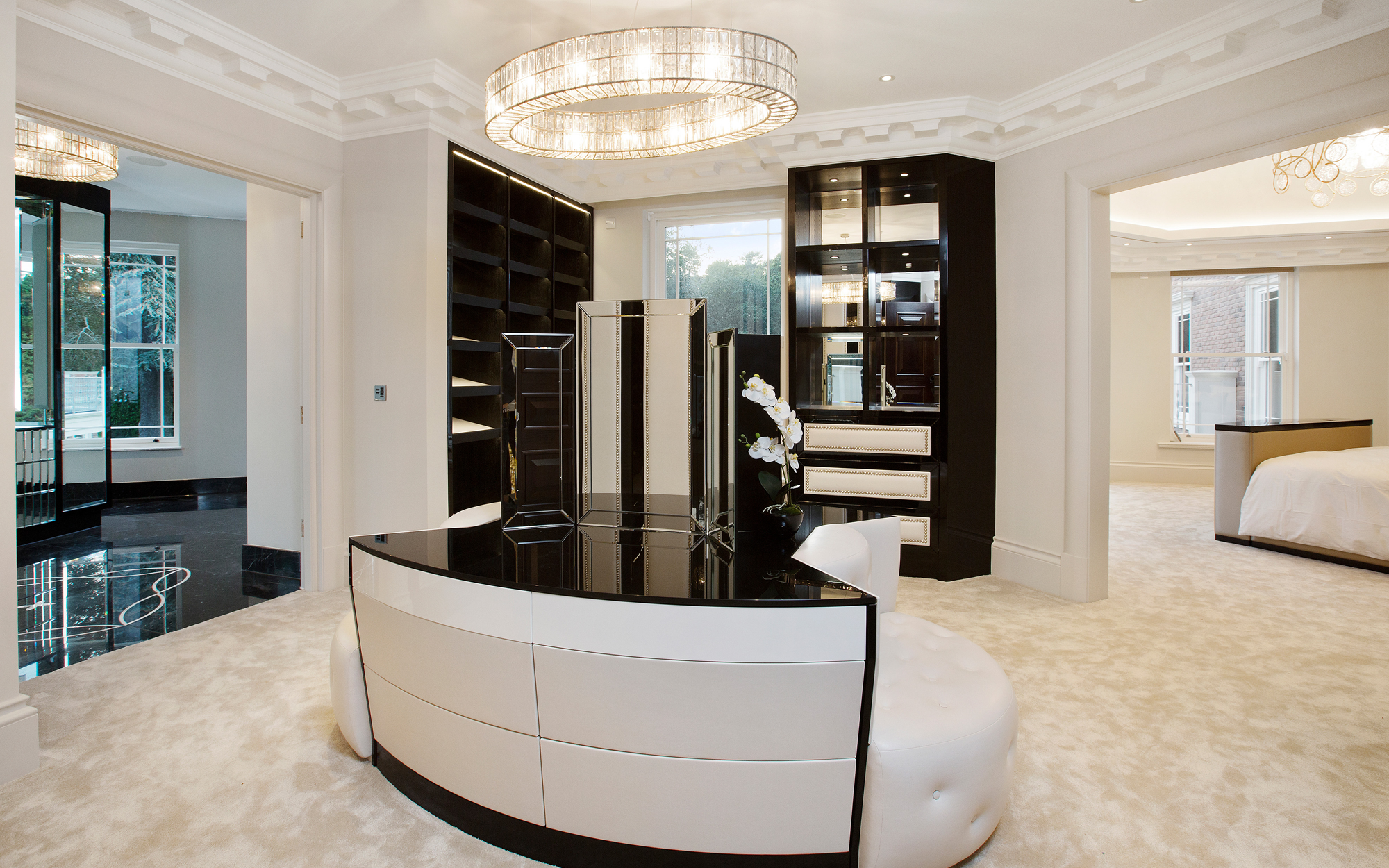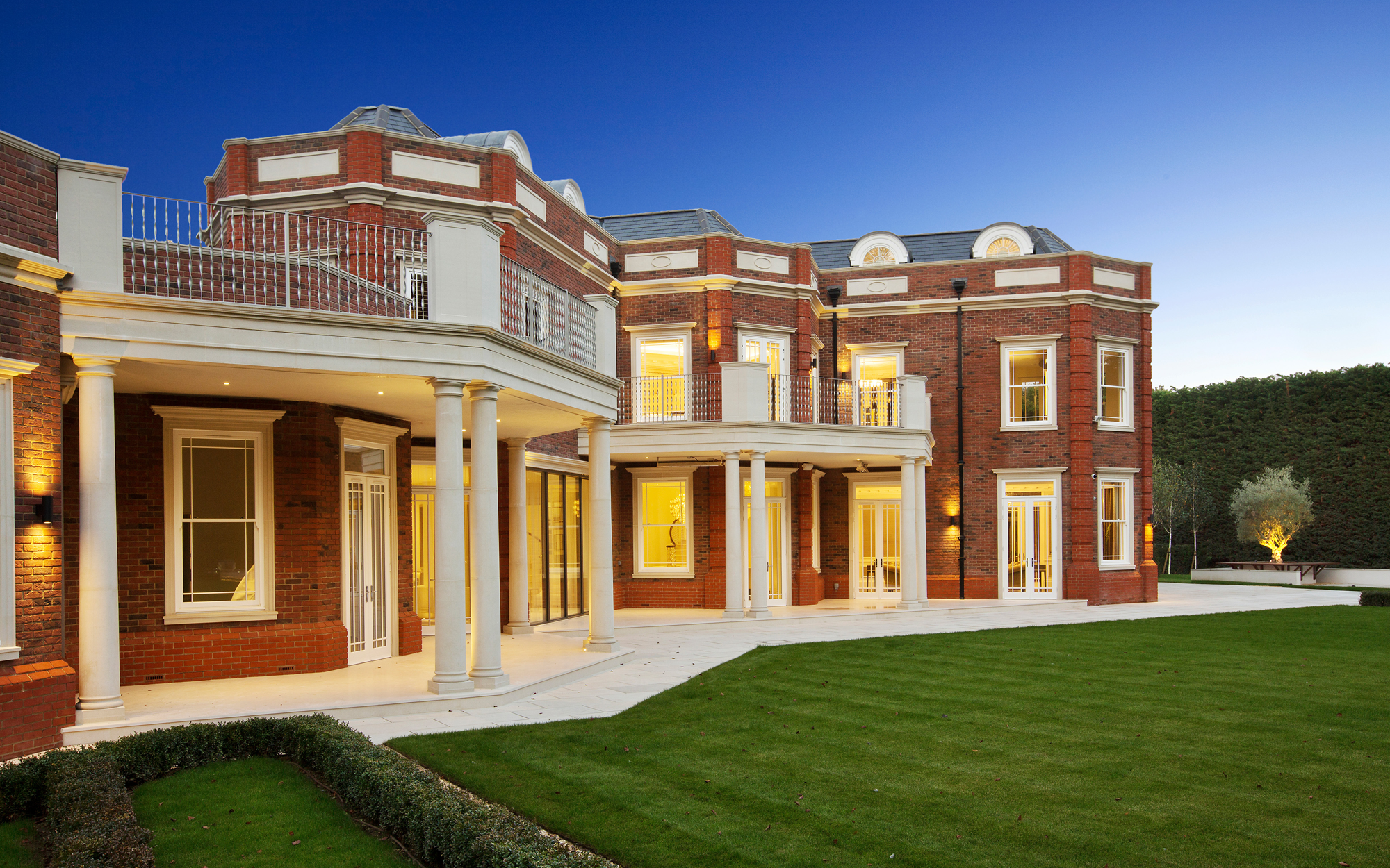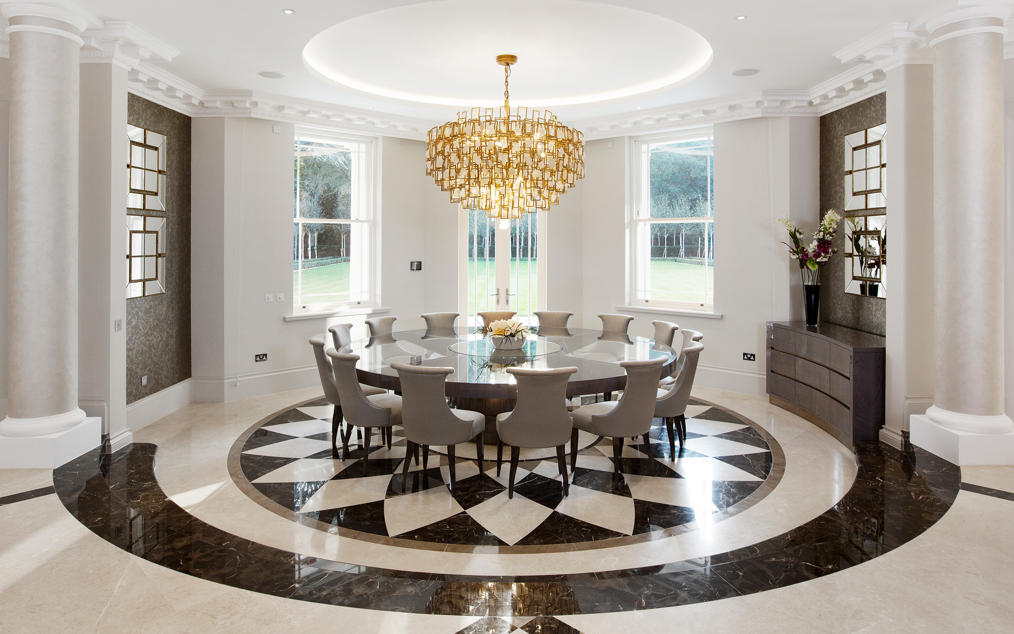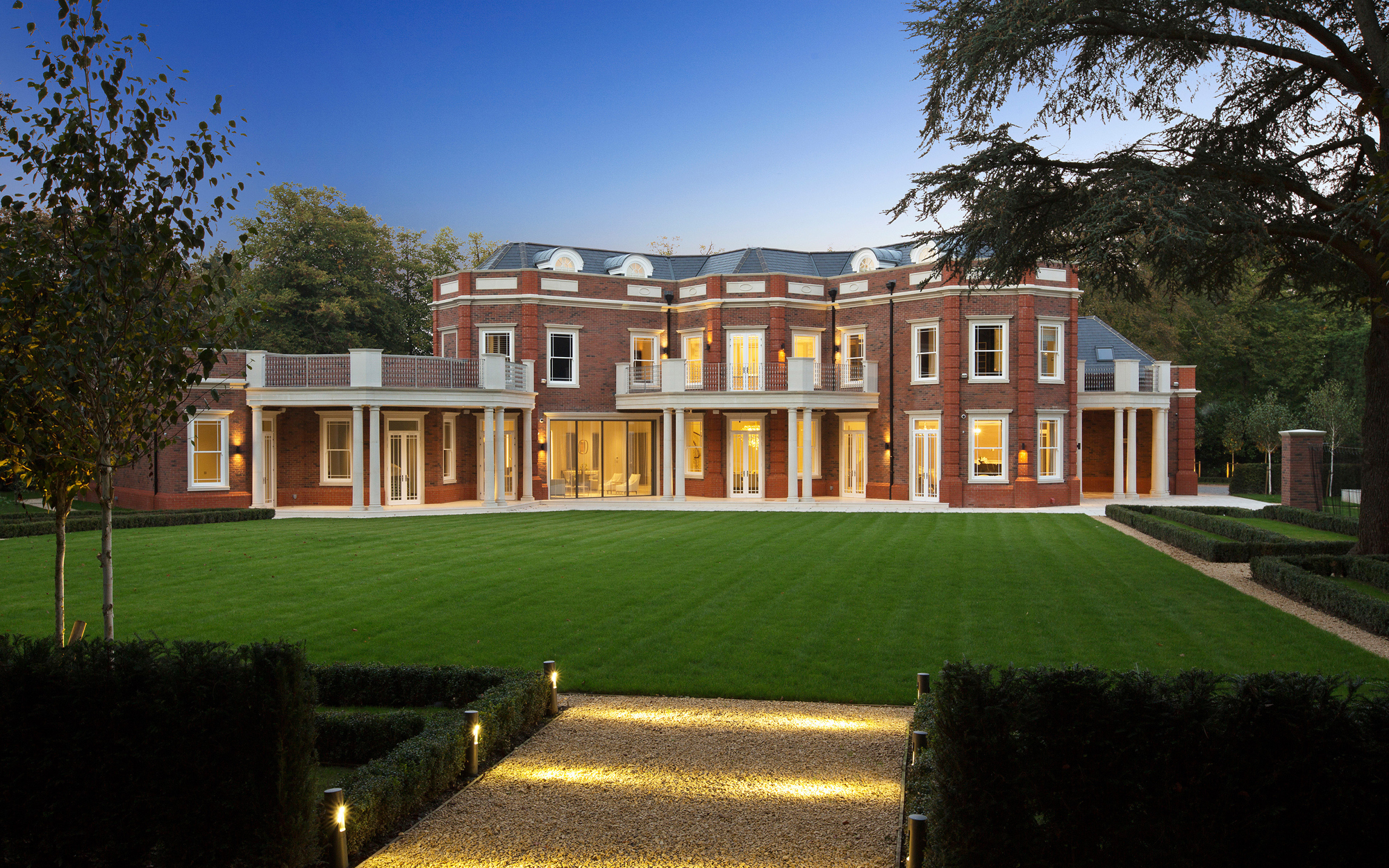 A truly imposing home, this private commission in Oxshott is 16,500 sq ft set on two acres. Curved lines add points of visual interest throughout, with marble inlay flooring and textured bespoke wall coverings giving a sense of luxury. An extensive home cinema and leisure complex featuring a pool, steam room and spa make this an extremely relaxing place to live.