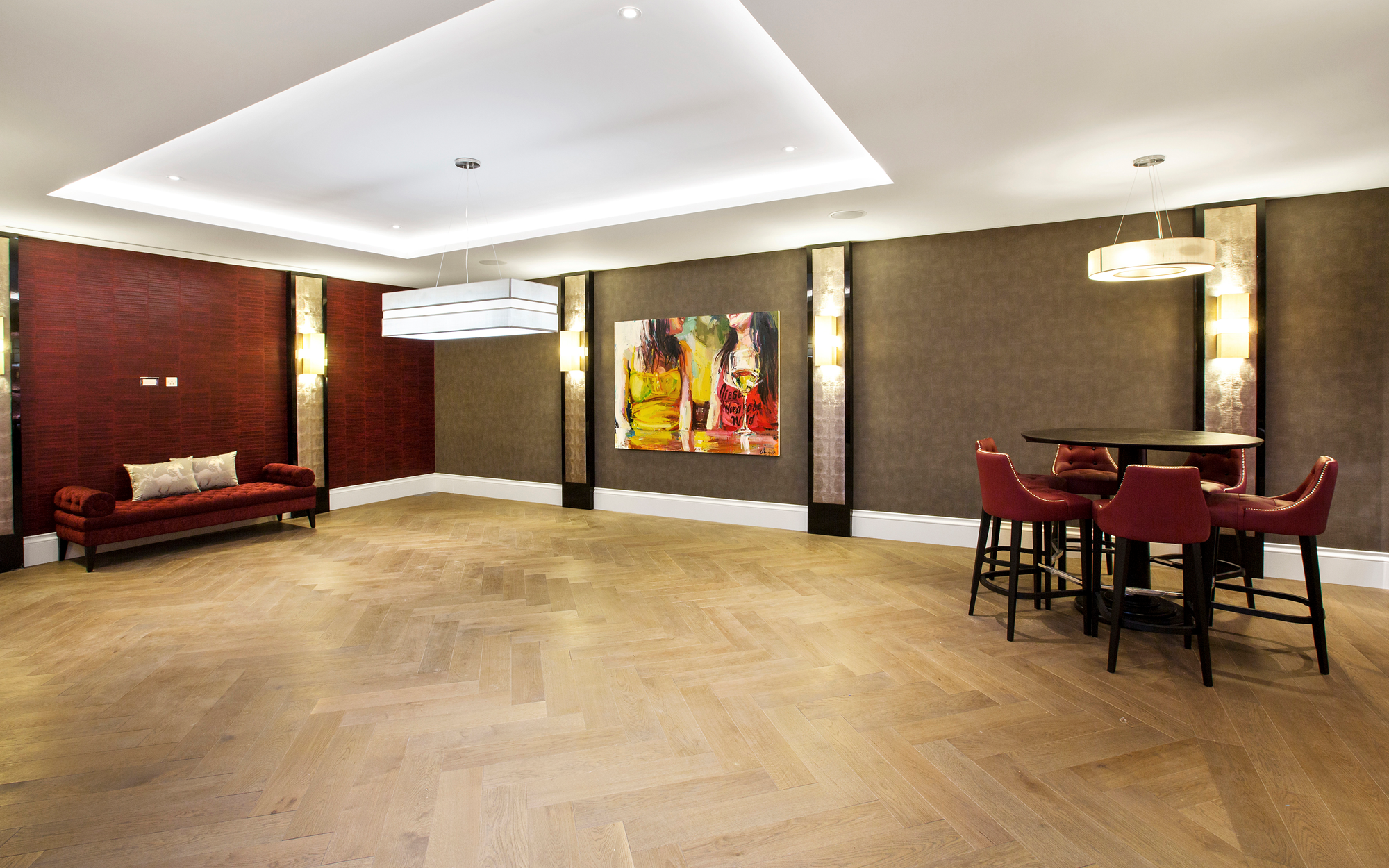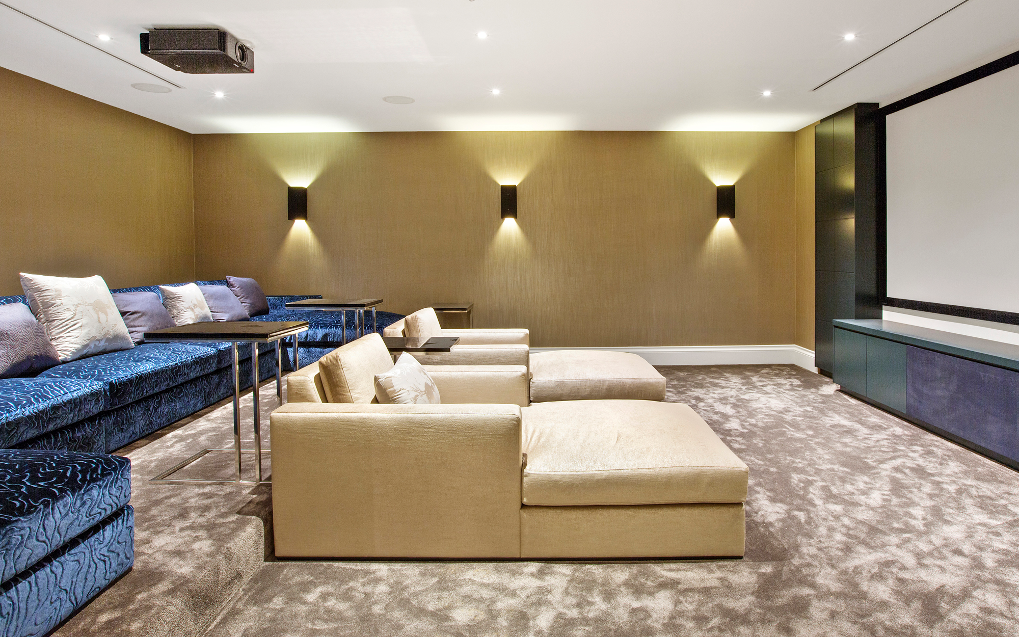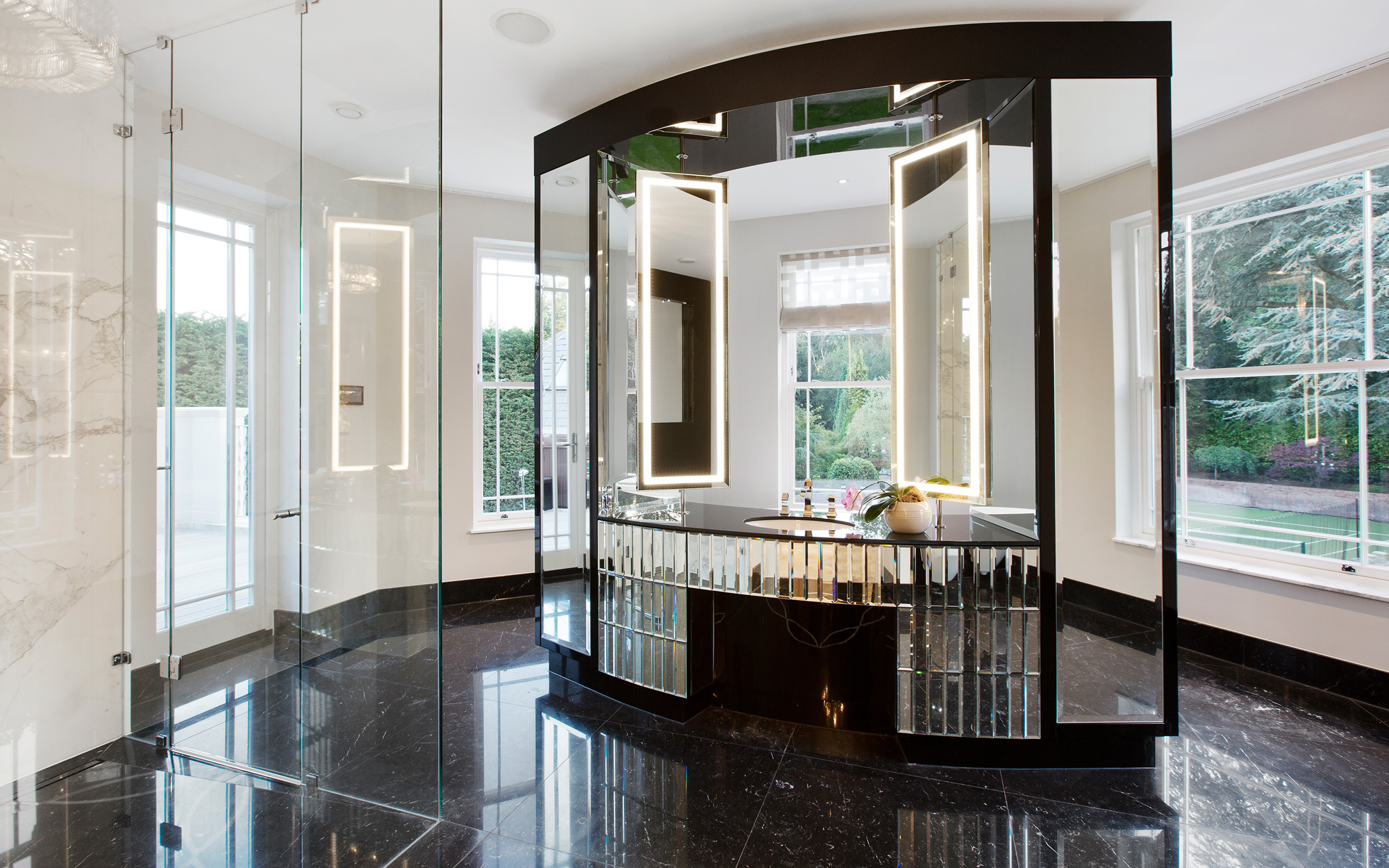 A truly imposing home, this private commission in Oxshott is 16,500 sq ft set on two acres. Curved lines add points of visual interest throughout, with marble inlay flooring and textured bespoke wall coverings giving a sense of luxury. An extensive home cinema and leisure complex featuring a pool, steam room and spa make this an extremely relaxing place to live.