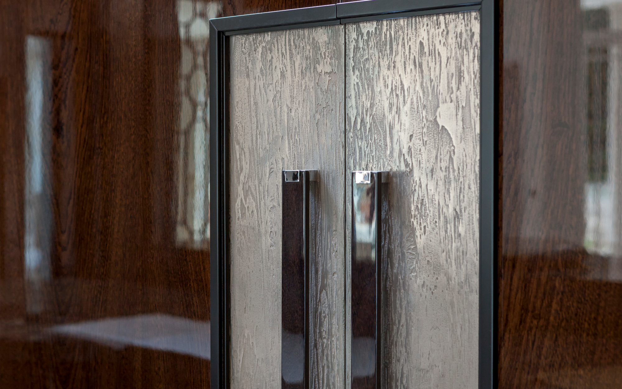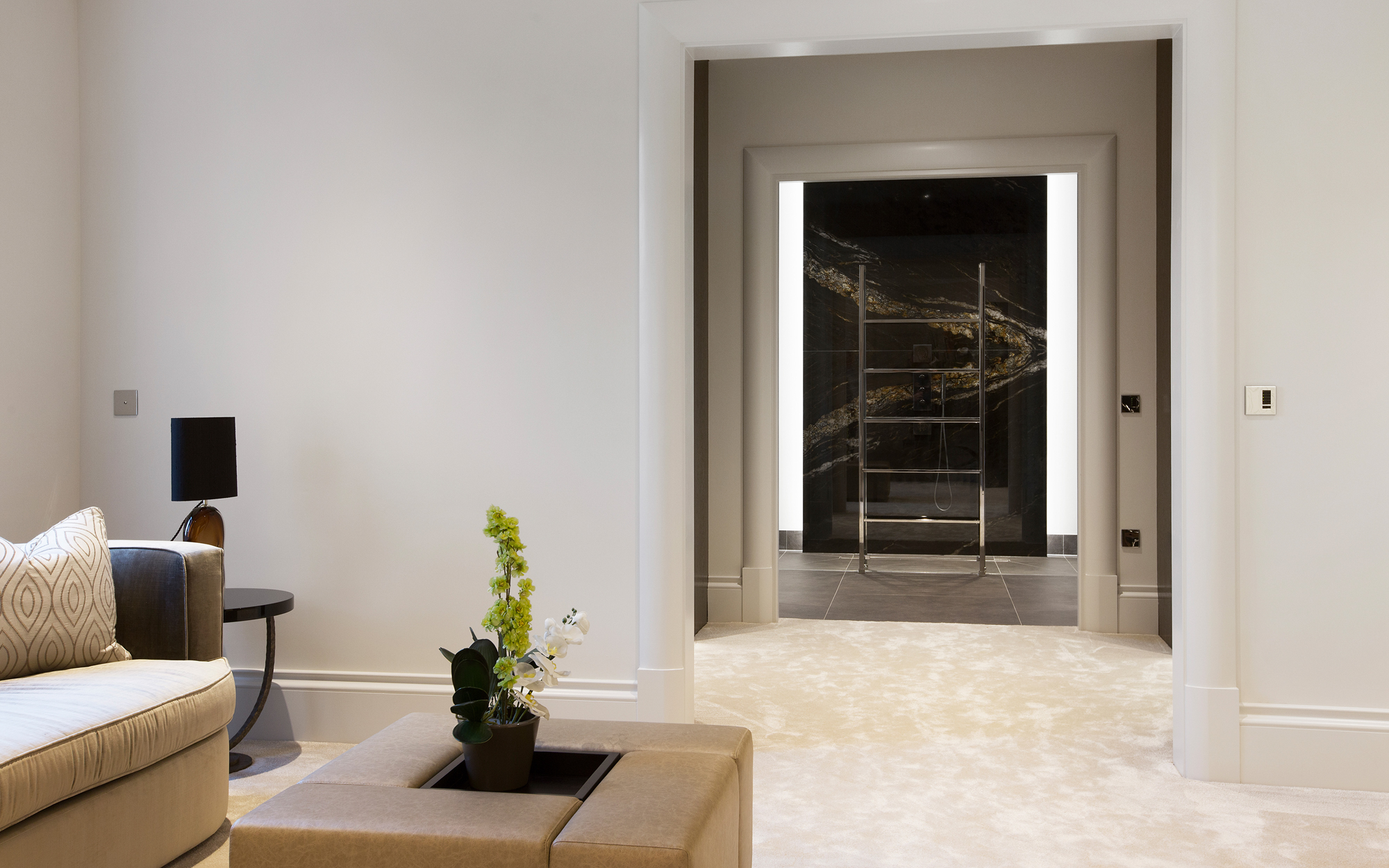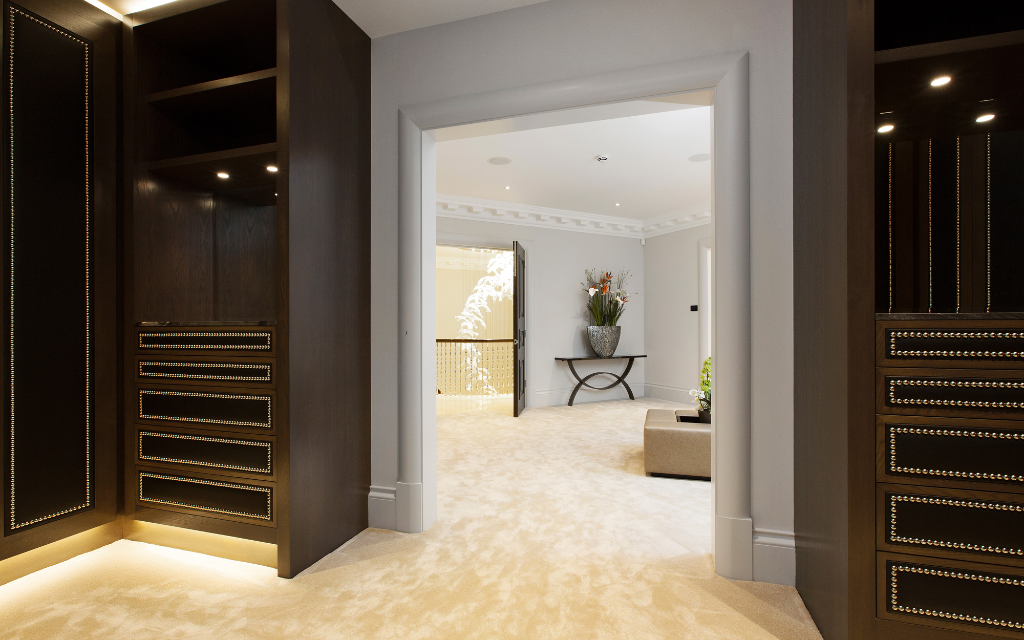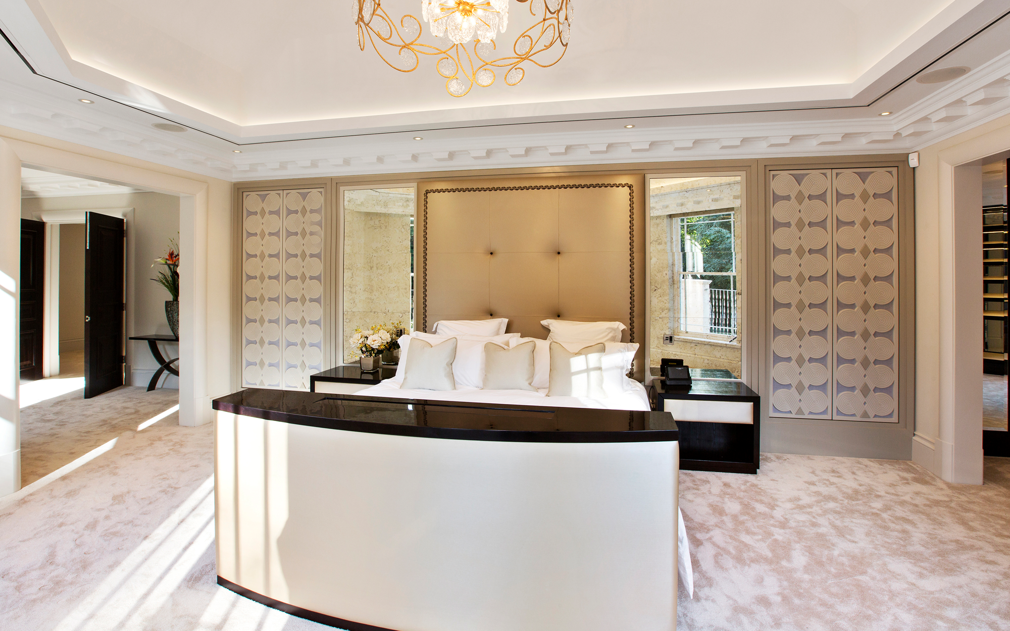 A truly imposing home, this private commission in Oxshott is 16,500 sq ft set on two acres. Curved lines add points of visual interest throughout, with marble inlay flooring and textured bespoke wall coverings giving a sense of luxury. An extensive home cinema and leisure complex featuring a pool, steam room and spa make this an extremely relaxing place to live.